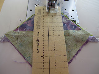 I pin the two ends of the seam, and lay a small strip of Stitching Lines on top. I line up one horizontal dotted line with the seam line on the top HST, and try to line up the center-line of strip with the corner points. I stitch on the two dotted lines.